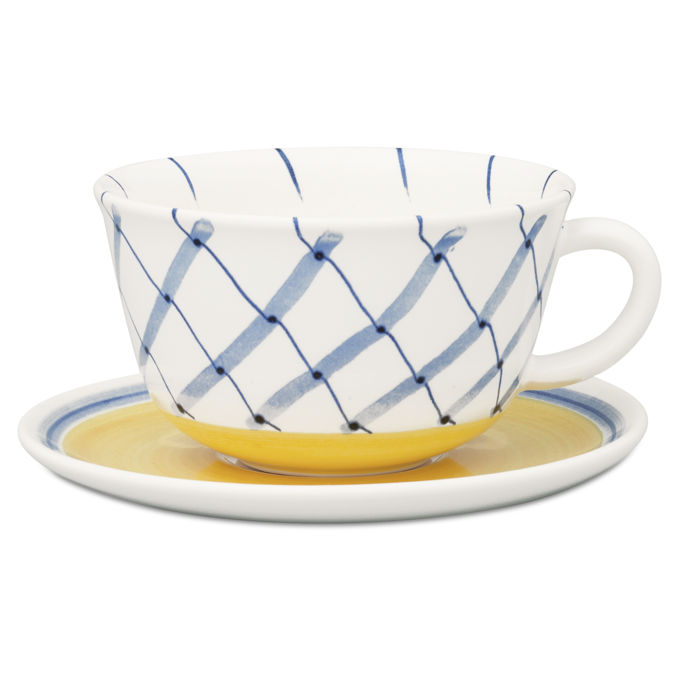 HB faience is created by inglaze painting. After the first firing, a white covering glaze is applied to the ceramics. After drying, our ceramic painters, some of whom were trained by Hedwig Bollhagen, hand-paint their famous colored faience decorations into the glaze. In the so-called smooth firing, the glaze combines with the decor painted with engobe and fixes it. The ceramic "safe" colors form the classics with blue, yellow and black. Red is considered a "volatile color" and often fades in the smooth firing. All colors belong to Hedwig Bollhagen's typical faience decors, which are to be understood as a homage to the farmer's pottery that she so admired.