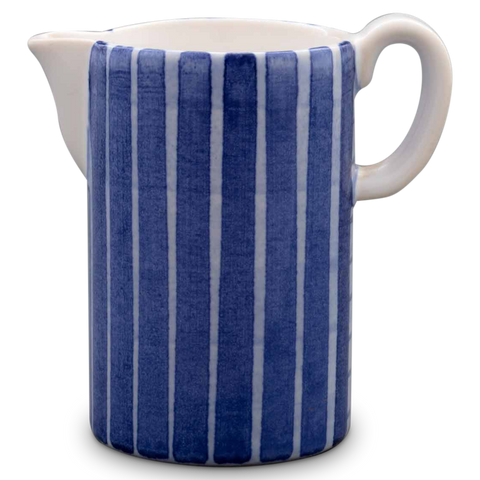 Fayence weiß mit engen blauen STreifen Glasur glänzend