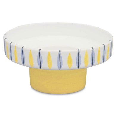 Fayence weiß gelbe Bänder und blaue Striche Glasur glänzend