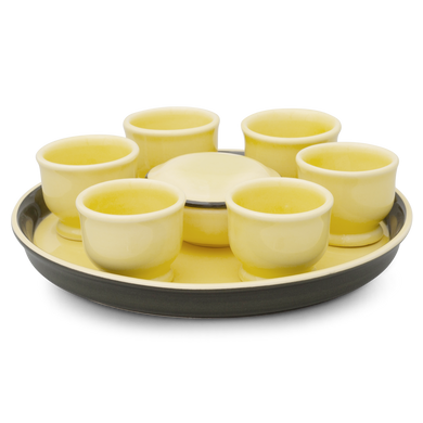 Das 8-teilige Eierbecher-Set von Hedwig Bollhagen bringt Eleganz und Funktionalität auf Ihren Frühstückstisch. Das Herzstück des Sets sind die vier handgefertigten Eierbecher (HB 521), deren bauchige Form und konischer Fuß das Frühstücksei stilvoll präsentieren. Ergänzt werden diese durch eine charmante Dose (HB 521), die sich ideal für Salz, Zucker oder andere Gewürze eignet und durch ihre klassische Gestaltung begeistert. Eine kleine Öffnung im Deckel lässt Platz für einen Löffel. Abgerundet wird das Set durch eine vielseitig einsetzbare Platte (HB 521), auf dem alle Teile ihren Platz finden – perfekt für ein harmonisches Frühstückserlebnis. Seit 1934 steht Hedwig Bollhagen für meisterhafte Handwerkskunst aus Marwitz. Jedes Teil dieses Sets ist Ausdruck dieser Tradition und hochwertigen Qualität.