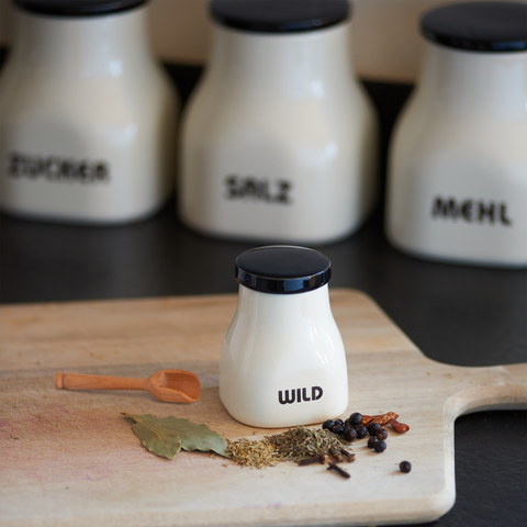 Die Gewürzdose „Wild“ HB 556 ist perfekt für die Aufbewahrung von Wildgewürzen oder speziellen Gewürzmischungen für Wildgerichte. Mit ihrer kompakten Höhe von 8,5 cm und einem Volumen von 0,13 Litern hält sie das Gewürz frisch und aromatisch. Der schwarze, dicht schließende Deckel schützt zuverlässig vor Feuchtigkeit, während der cremefarbene Korpus mit der schwarzen Aufschrift „WILD“ nicht nur funktional, sondern auch ein stilvoller Blickfang in der Küche ist. Die klare, schlichte Formgebung dieser Dose ist vom Bauhausstil inspiriert und bringt zeitlose Eleganz in jedes Zuhause. Diese handliche Dose gibt es auch für viele andere Gewürze wie Chili, Curcuma, Piment oder Rosmarin, sodass Sie Ihre Gewürzsammlung perfekt organisiert halten können. Für größere Vorräte wie Nudeln, Tee, Kaffee oder Reis eignet sich die größere Variante HB 595 ideal. Beide Dosen stehen für langlebige, handgefertigte Qualität und vereinen Funktionalität mit der klaren Ästhetik des Bauhausstils, für den die Hedwig Bollhagen Werkstätten seit 1934 bekannt sind.