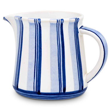 Fayence weiß mit verschieden blauen Senkrechtbändern Glasur glänzend