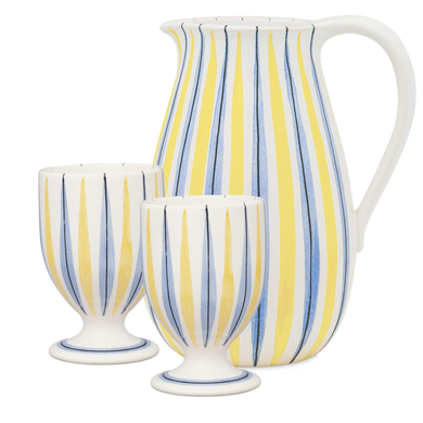 With the 3-piece jug-cup set HB 1100 by Hedwig Bollhagen, stylish craftsmanship enters your table. The generous jug (HB 1100) impresses with its pear-shaped, voluminous form and a capacity of one liter – ideal for juices, water, or refreshing drinks. The large handle ensures a secure grip, while the drip-free spout makes pouring easier. The set is complemented by two elegant footed cups (HB 597), designed by the artist Heidi Manthey. These chalice-shaped... Cups with a conical base hold 0.2 liters each and give every drink an almost royal touch. Handcrafted in the Marwitz workshops, this set represents the outstanding ceramic tradition that Hedwig Bollhagen has been shaping since 1934. The ensemble is perfectly complemented by a matching Serving platter to stylishly serve delicious treats and small snacks, or a bowl that is ideal for fresh fruit or pastries. A timeless Set that masterfully combines functionality and aesthetics.