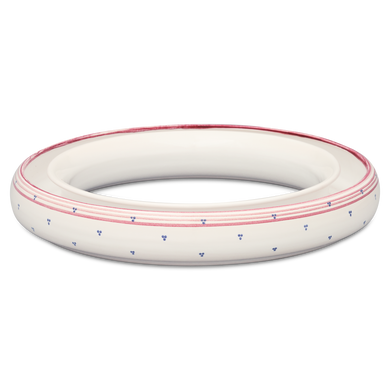 The flower ring with the shape number "735B" by Hedwig Bollhagen is the middle sister of the small (735A) and large (735C) flower rings. Characteristic is the ring-shaped, upwardly open, and water-fillable body made of sturdy ceramic. With a height of four centimeters and a diameter of 26 centimeters, the flower ring has the ideal size for most tables in the house. Whether early bloomers or colorful summer flowers, adorned with a colorful sea of blossoms, the flower ring enhances any ambiance. Even in winter, decorated with fir greenery, cones, or dried flowers, the flower ring draws all eyes to itself. It is green not only in summer but also in winter when it snows.