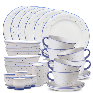 With Hedwig Bollhagen’s 32-piece 490 breakfast set, every morning begins with timeless elegance and handcrafted quality. The set for six people includes six dinner plates 123, six coffee cups 490 with matching saucers, six egg cups 521, six versatile bowls 525, as well as a salt shaker 523 and a pepper shaker 523P—all harmoniously coordinated. The elegantly shaped dinner plates provide the perfect base for fresh rolls or fruit, while the generously sized coffee cups ensure the perfect start to the day. The bowls are ideal for cereal, yogurt, or small snacks, while the charming egg cups stylishly showcase every breakfast egg. The salt shaker 523 and pepper shaker 523P round out the ensemble—perfect for seasoning your egg or other dishes to your taste. Since 1934, these high-quality ceramics have been handcrafted in the Marwitz workshops—a tradition that masterfully combines functionality and design. Complete the set with a matching butter dish, jam jar, or coffee pot to stylishly complete your breakfast table. A collection that combines enjoyment and aesthetics at the highest level.