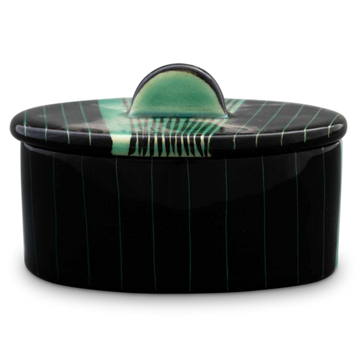 The jar by Hedwig Bollhagen with the shape number "876" captivates with its timelessly appealing design character with a charming nostalgic touch. Typical for the two-piece set, consisting of ceramic jar and closure, are the oval flowing, straight-line body and the flat lid with harmoniously curved, half-cone-shaped handle. With a height of 10 centimeters and a length of 13 centimeters, the shapely ceramic jar is ideal for storing various delicacies and jewelry treasures. The 100 ml capacity and only 190 grams light tin with handle 876 is a handmade unique piece that always sets tasteful accents in the interior and convinces with high functionality.