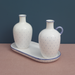 The three-piece vinegar-oil set HB 533 is a stylish and practical addition to any kitchen and dining table. The two handcrafted flacons – HB 533E and HB 533O – impress with their elegant, bulbous shape and a narrow neck that allows for precise pouring. While the flacon HB 533E captivates with its simple, harmonious design, the HB 533O offers additional comfort with its handy grip. Both flacons hold 0.38 liters and are equipped with a functional natural cork that keeps the contents fresh. The set is complemented by the plate HB 486, whose elliptical design perfectly rounds off the ensemble. With a length of 24 cm, it provides a stylish base for the flacons and is also ideal for serving small delicacies. Since 1934, these timeless ceramics have been handcrafted in the Hedwig Bollhagen workshops in Marwitz – for the highest quality and artistic elegance on your table. Perfectly combinable with our salt and pepper shakers, labeled spice jars, or a matching butter dish for a harmonious table arrangement. Discover our entire range of handcrafted. Tableware and bring artisanal elegance into your everyday life.