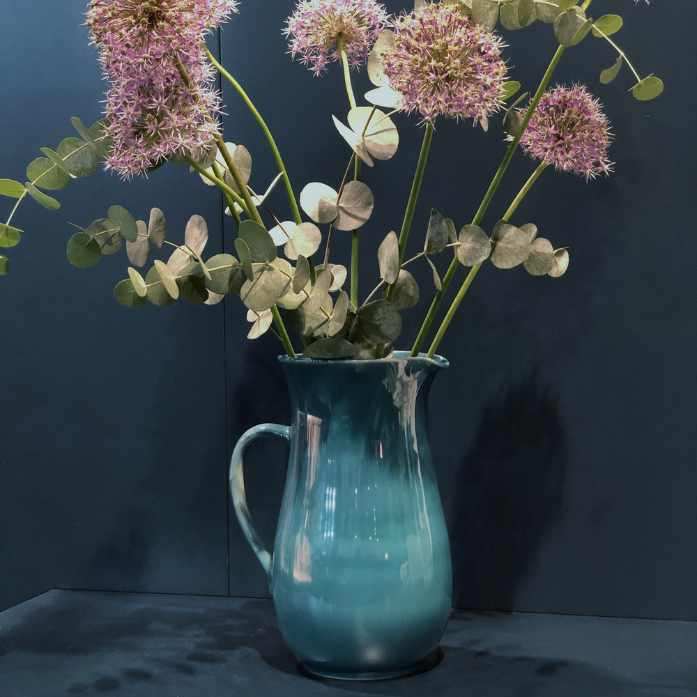 The pitcher with the shape number "W10" was designed by the Bauhaus ceramist Werner Burri and captivates with its original shape. The pear-shaped body with the discreetly outward flowing neck is characteristic. The roughly centered hinged handle and the diametrically opposed drip-proof pouring spout, which is positioned outward, elegantly round off the Bauhaus design. At 26 centimeters tall and 20 centimeters wide, the pitcher is almost as wide as it is tall. And with a capacity of three liters, it already belongs to the large thirst quenchers in the Hedwig Bollhagen range. Its clear design language makes it a main protagonist of a cultivated table.