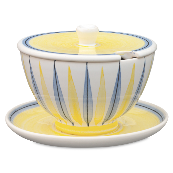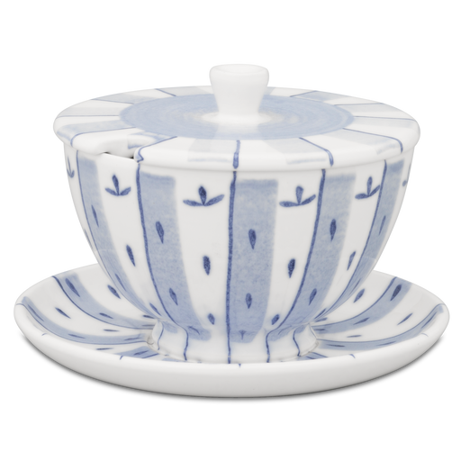 The gravy boat with lid by Hedwig Bollhagen combines nostalgic-classic form elements without forgetting the zeitgeist of modern design demands. The hand-made and painted gravy boat has a capacity of 350 ml and is thus ideal for tastefully serving various sauces, marinades, dressings or dips. With a size of 12 centimeters high and 14 centimeters wide, it takes up little space on the table or table and yet always represents a highlight. On the saucer body rises the firmly connected sauce bowl with flowing dignified contours. The removable lid with a small opening is adorned with a trapezoidal, hinged knob. The 600 gram light ceramic gravy boat with lid is a practical all-rounder that enhances any table decor in an appealing way.
