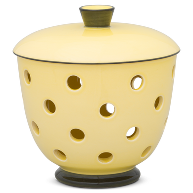 The onion pot with the shape number "549ES" from Hedwig Bollhagen is the big sister of the smaller version 549DS. With a height of 18 centimeters and a width of 19.5 centimeters, the onion pot 549ES is almost as high as it is wide. Its characteristic feature is the spherical bulbous body that opens conically at the top. The cone-shaped handle on the bulbous upward curved lid elegantly rounds off the design. Thanks to the numerous holes in the wall of the vessel, distributed and each about one centimeter in size, the air can circulate well. The two-piece set of jar and lid not only provides shallots, onions and garlic with a sustainable and stylish storage space, but the dark interior also keeps the leeks fresh and tasty for a long time.